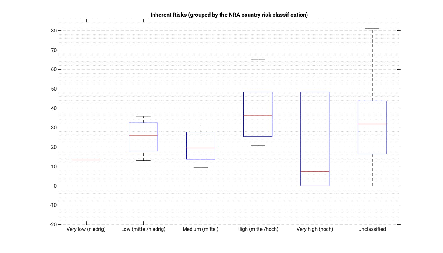 We also tested whether the classifications are supported by quantitative indicators from our AML country risk score. When looking at inherent risk related to predicate offences such as drug trafficking and corruption, high-risk countries generally show higher median risk values. However, the relationship is far from consistent. Countries classified as “very high risk” display a wide dispersion. Russia and Turkey have high inherent risk levels, but jurisdictions such as the Cayman Islands or Jersey are not known for high levels of organised crime. This suggests that inherent criminal risk alone does not fully explain the NRA classifications.