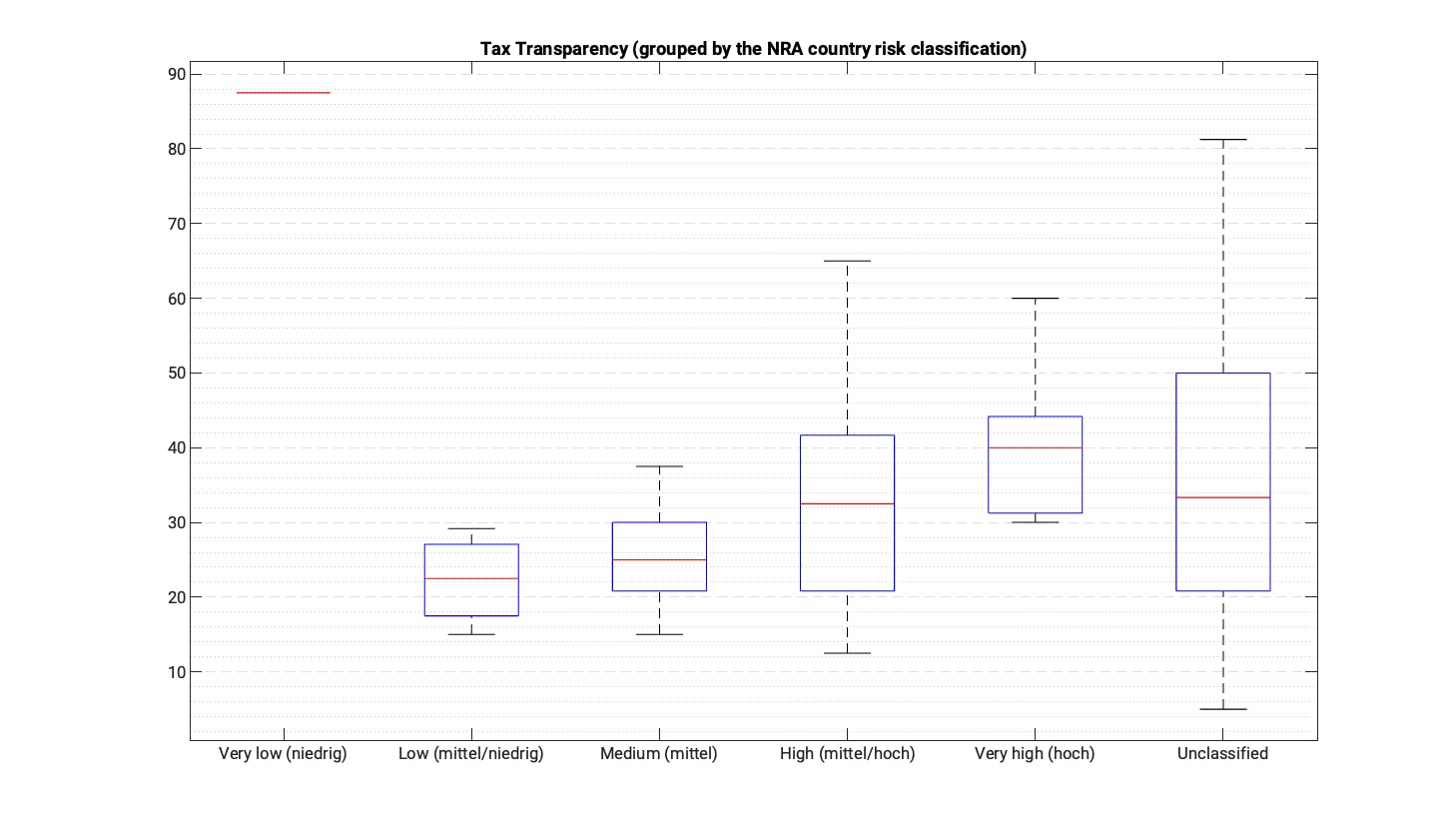 A much stronger relationship emerges when looking at financial secrecy and tax transparency indicators. Countries classified as high risk tend to score poorly on transparency measures. This seems to be a key explanatory driver. Interestingly, Vanuatu, the only country rated “very low risk” in the NRA, is a clear outlier, given its weak transparency record and active investor citizenship schemes.